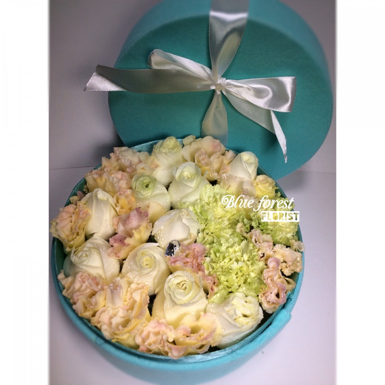 冬日戀曲*真珠白玫瑰花配淺藍絲絨花盒