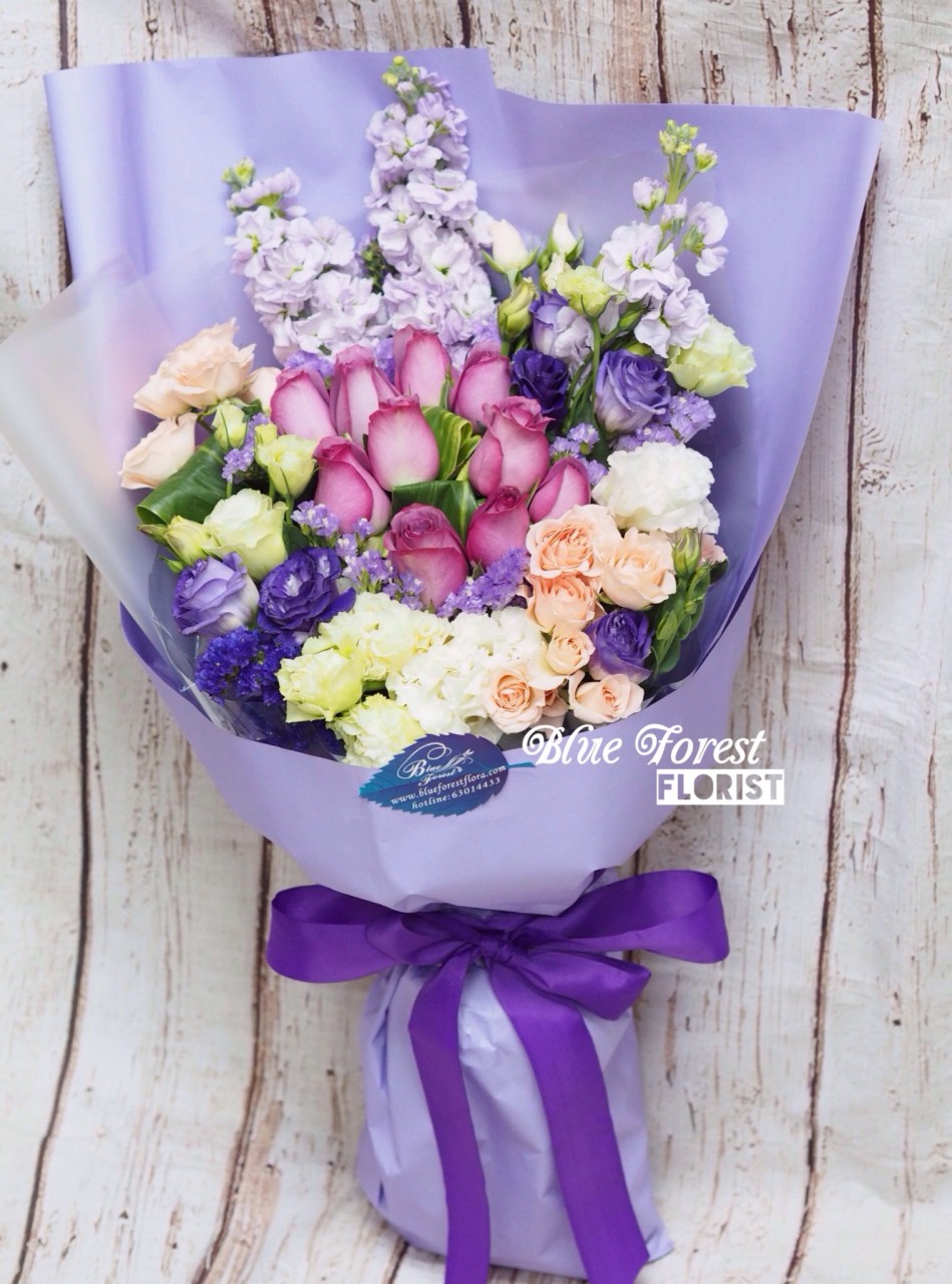 客人滿意回相片及好評*紫玫瑰配多種襯花花束