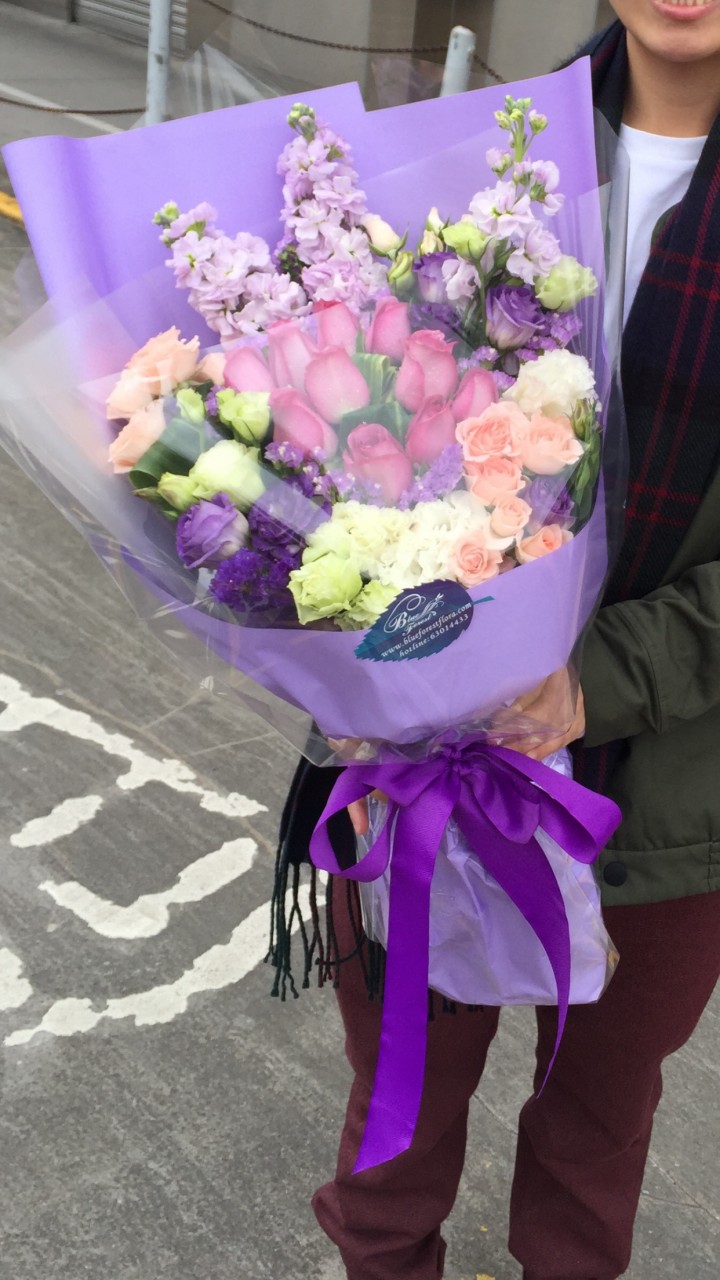 客人滿意回相片及好評*紫玫瑰配多種襯花花束