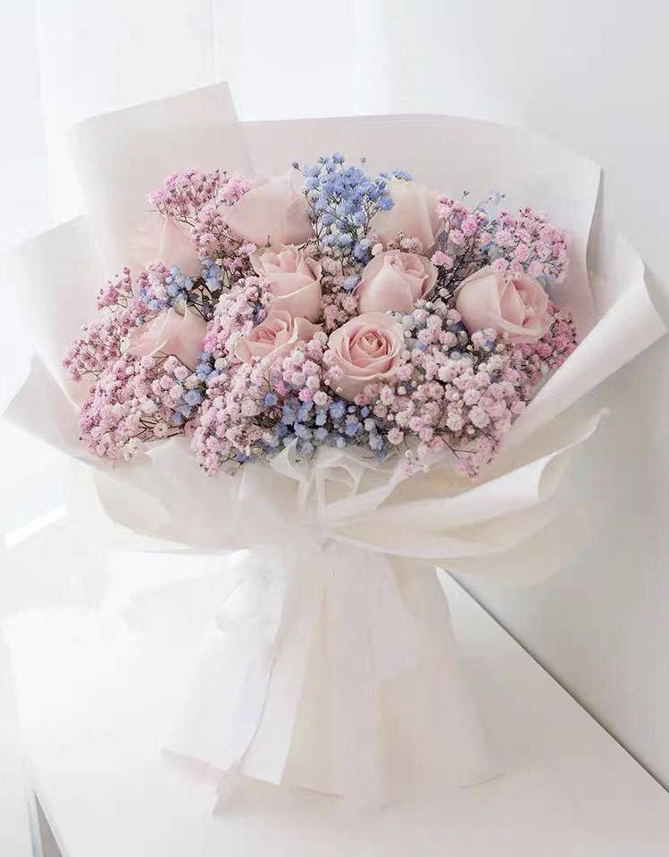 小清新*36/50枝淡粉紅玫瑰配滿天星花束*