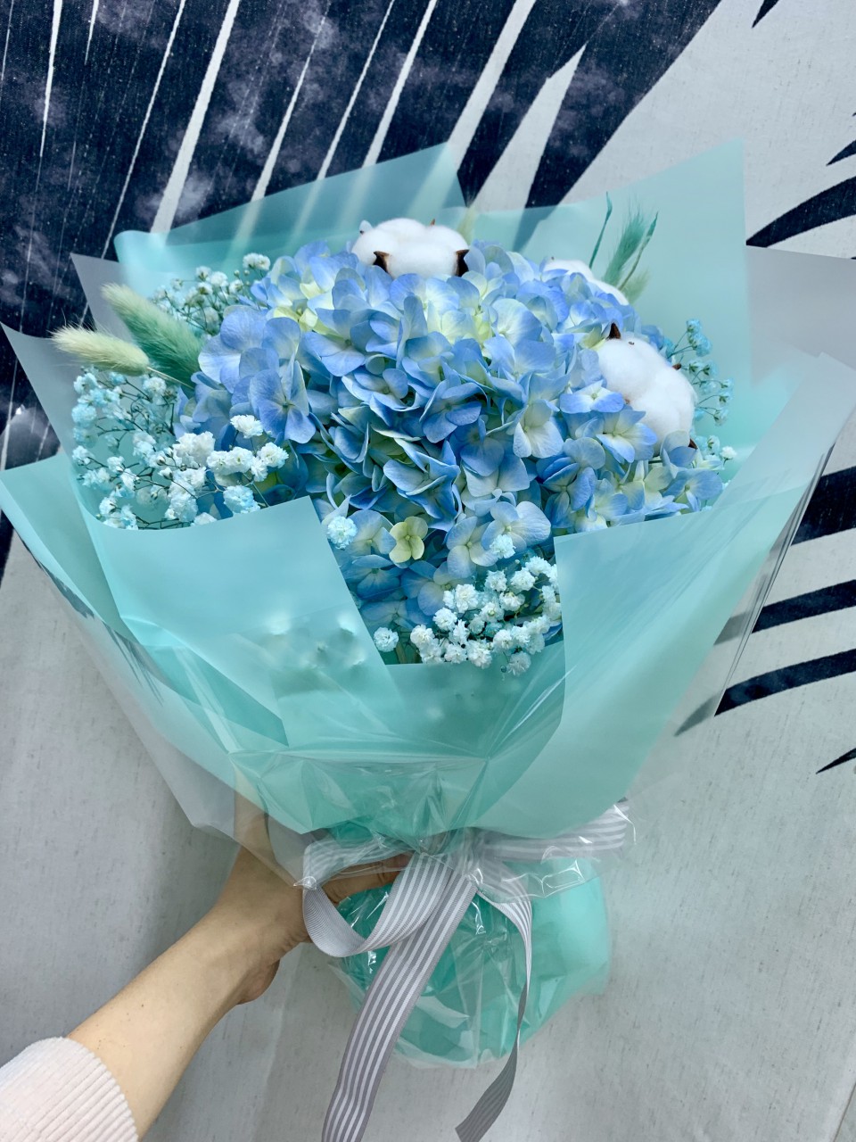 韓式花束*荷蘭秀球綿花配滿天星花束(Tiffany Blue包裝)*