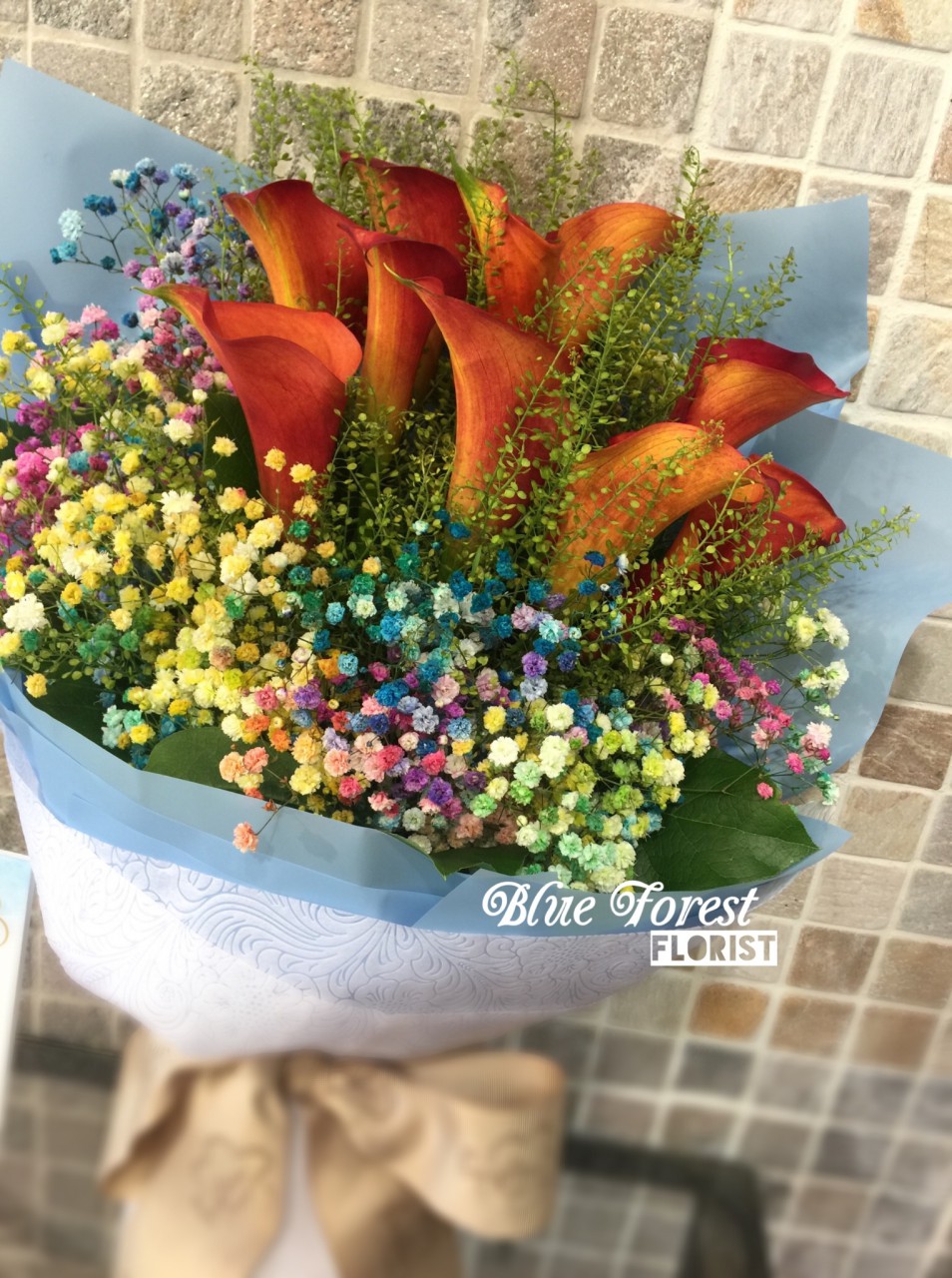 荷蘭橙黃色馬蹄蘭連襯花花束
