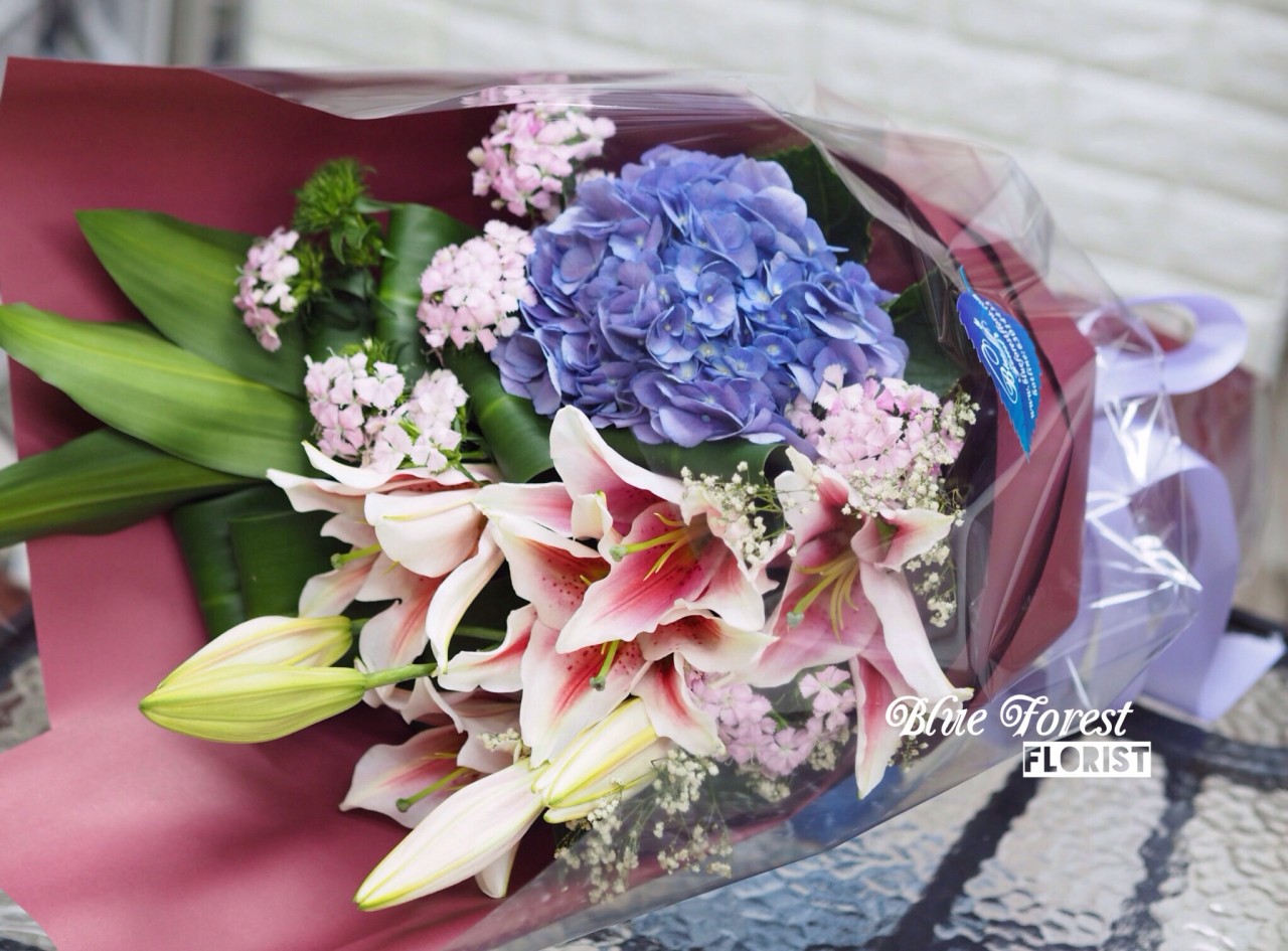 莎寶娜粉百合配荷蘭繡球花束