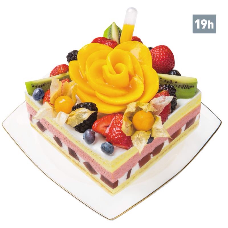 新鮮芒果、藍莓、奇異果、士多啤梨配法國士多啤梨果蓉啫喱、芒果慕絲、牛奶慕絲、法國白朱古力杏仁脆蛋糕,長5.3吋,約1.8磅