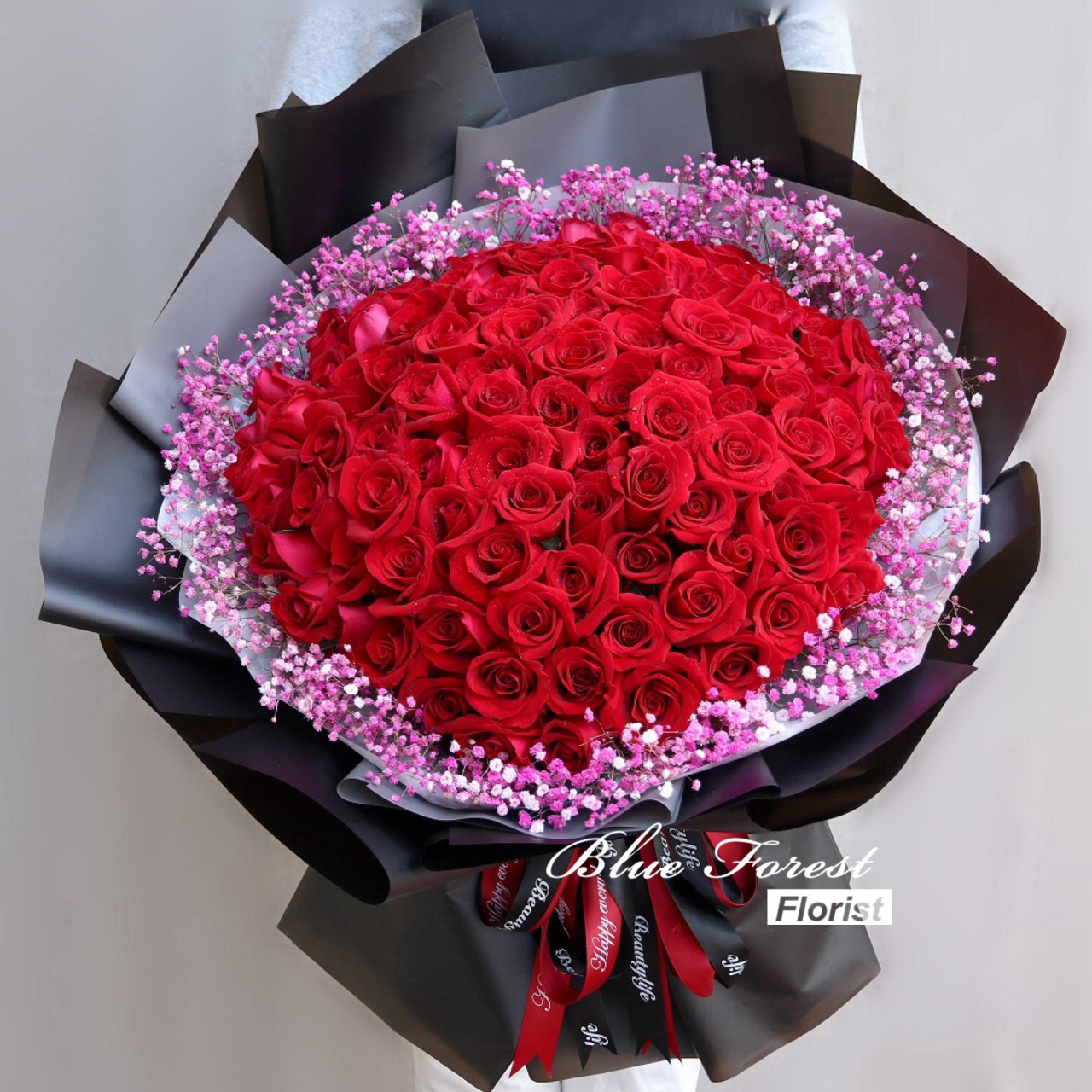 99枝紅玫瑰配滿天星花束(可選白色/黑色包裝)